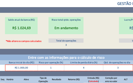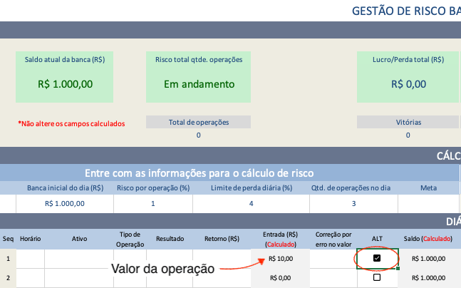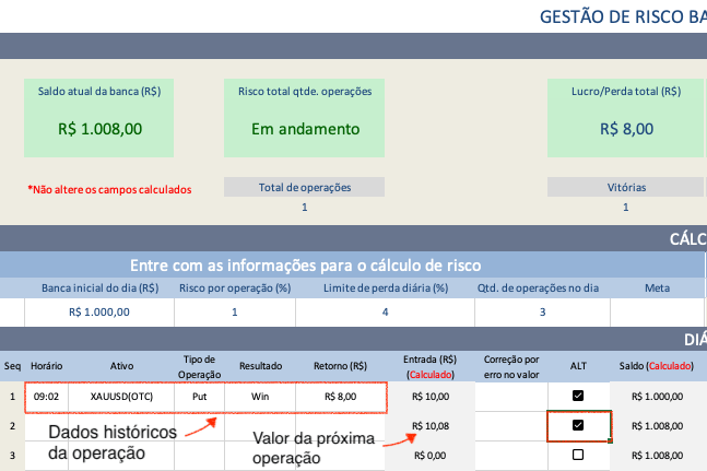 Após o encerramento da operação na plataforma da corretora, registre os seus dados históricos e obtenha o valor da próxima operação clicando no checkbox referente a operação seguinte.