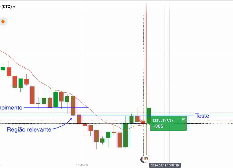 6) Operação - Após a atuação compradora, como no caso demonstrado, a defesa expressa no pavio da primeira vela do movimento oposto ainda pode funcionar como contenção do preço. Por isso, é fundamental que a vela de reversão após o teste, conforme descrito no item 5, não volte a testar esse pavio, preservando a qualidade da sustentação compradora.