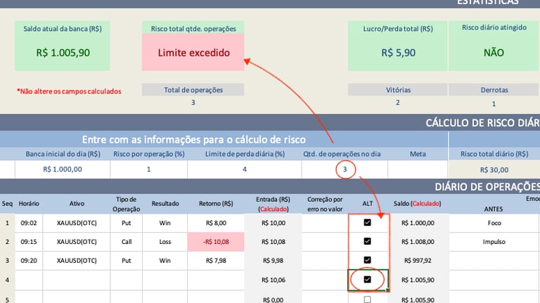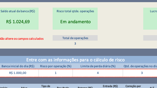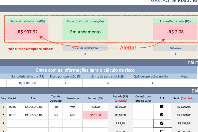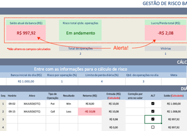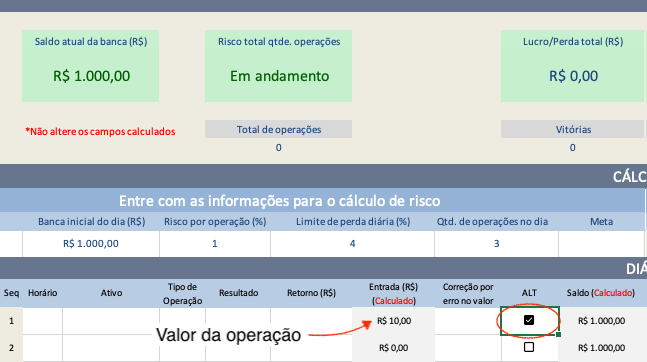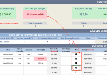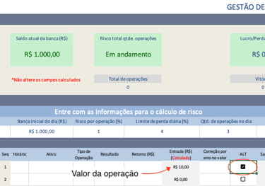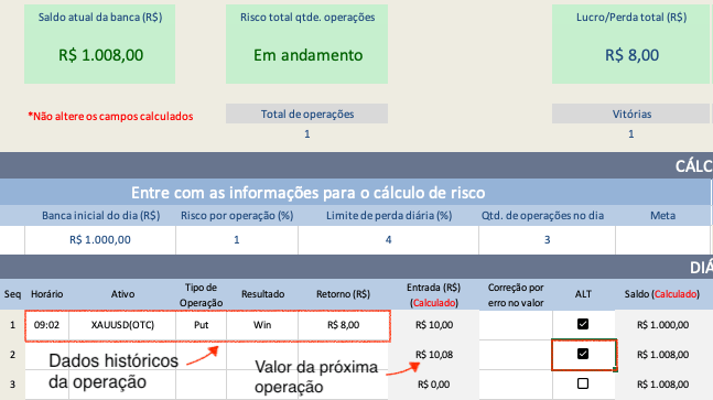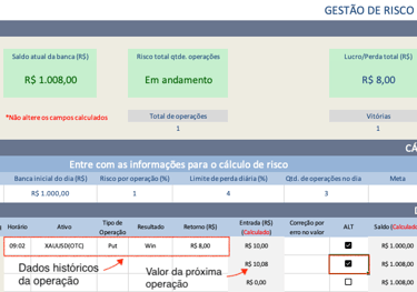 Após o encerramento da operação na plataforma da corretora, registre os seus dados históricos e obtenha o valor da próxima operação clicando no checkbox referente a operação seguinte.